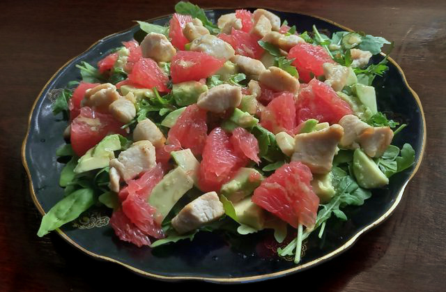 Куриное филе 360 г, грейпфрут 280 г, авокадо 210 г, салатный микс 120 г, орехи 70 г, масло 26 мл, бальзамик 14 мл, мёд 9 г. Заправку вмешивайте непосредственно перед подачей.