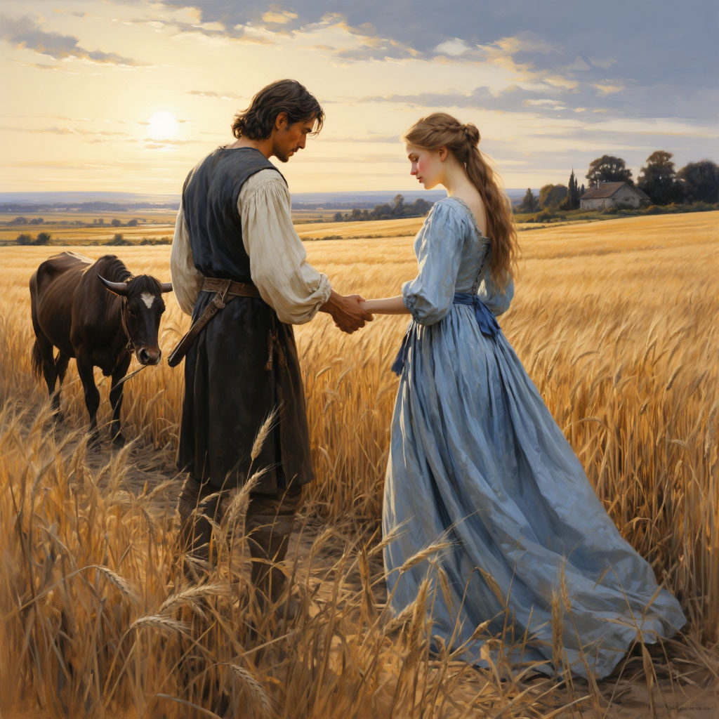 ...жила молодая царица по имени Василиса.Она была невероятно красива, умна и добра. Её любимым цветом был синий — цвет неба и морской глубины. Однажды она полюбила простого юношу-пахаря, который работал в полях. Их любовь была тайной и чистой, как родниковая вода.