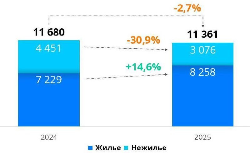🔶 За 11 месяцев в жилом и нежилом сегментах зарегистрировано 107,3 тысяч ДДУ – это на 11,8% меньше цифр января-ноября прошлого года, а по
