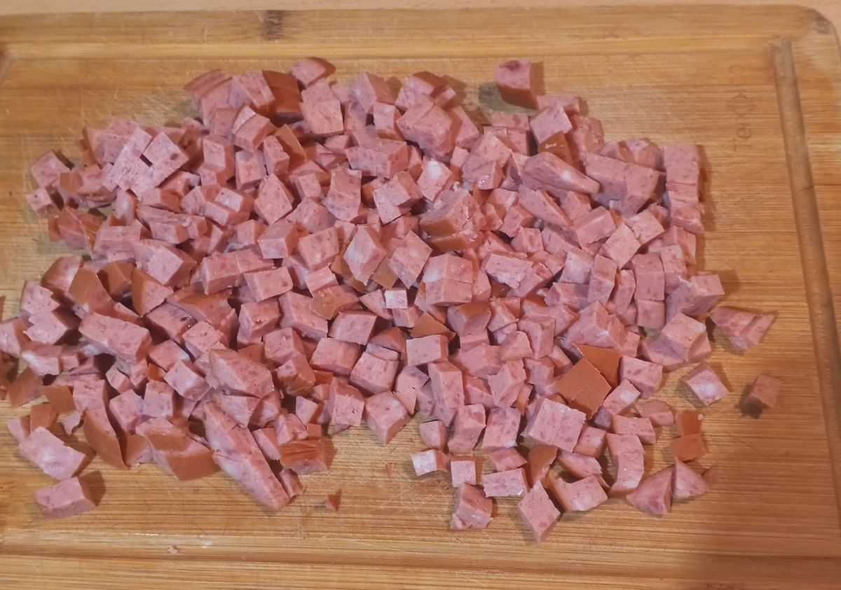 Колбасу режем кубиками, соломкой или кружочками. У меня получились мелкие кубики.