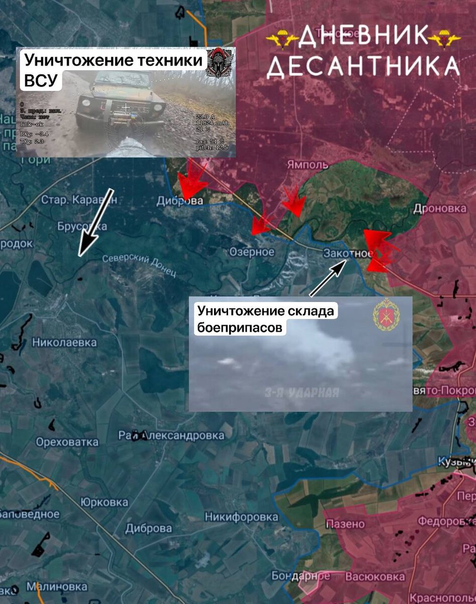 Бойцы ВС РФ расширяют зону контроля у Закотного, в лесном массиве у Ямполя и у Диброва. ▫️Северо-западнее Диброва в лесном массиве в ходе боев бойцы 25-й армии выбили немца из двух опорников. ▫️Севернее Озерного идут бои за опорные пункты и жилой сектор, где укрывается противник. ▫️В районе Закотного группы ВСУ, которые закрепились на высоте в норах, ведут огневое воздействие по нашим наступающим войска в кармане у Ямполя, где ведется зачистка в лесных зонах. 🚀 Бойцы 3-й общевойсковой армии продолжают зачистку восточнее Закотного, удалось с тяжелыми боями продвинуться в самом селе и примыкающей балке. 🚀 Операторы БПЛА ведут наблюдение и выявление вражеских позиций и групп на всем участке. Работа идёт в плотном взаимодействии с артиллерией и авиацией. ▫️ Так в Закотном военнослужащие 2-й артиллерийской бригады сожгли полевой склад ВСУ. Воздушной разведкой был выявлен полевой склад противника с боеприпасами и топливом. После чего расчёт 152-мм гаубицы 2А65 "Мста-Б" отработали по