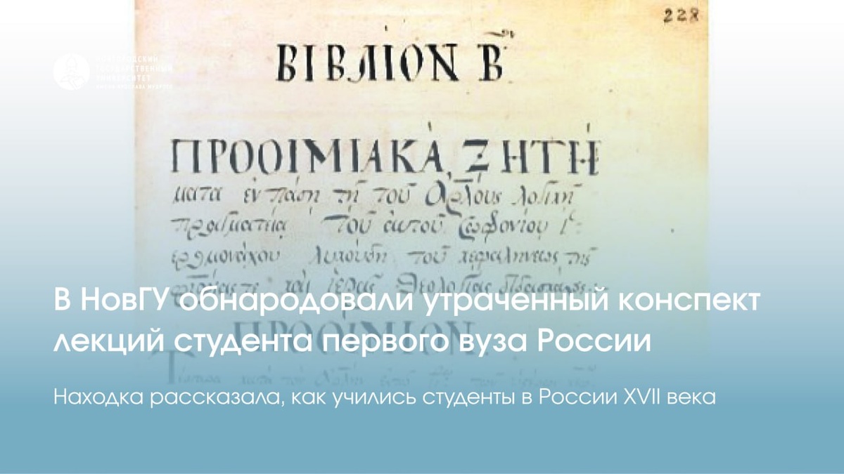 В Новгородском государственном университете сделано уникальное открытие в области истории образования. Исследователи ввели в научный оборот ранее неизвестную рукопись конца XVII века — конспект лекций по философии, который вел один из студентов первого высшего учебного заведения Московского государства - Славяно-греко-латинской академии. Исследование позволяет по-новому взглянуть на истоки отечественной науки и высшей школы.