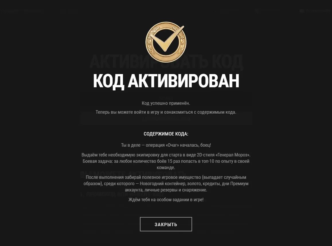 Новогодний Бонус-код OCHAG. Что даёт: Задачу можно выполнить до 26 декабря 2025 года 0:59 (МСК). Только в случайных боях или генеральных сражениях. Условие: за любое количество боёв 15 раз попасть в топ-10 по опыту в своей команде. Награда: Случайная награда (Новогодний контейнер, золото, кредиты, дни Премиум аккаунта, личные резервы и снаряжение). Кто уже выполнил, напишите в комментариях что дают. Я побежал выполнять. Активируем код тут: https://lesta.ru/shop/redeem/?bonus_mode=OCHAG Ты в деле — операция «Очаг» началась, боец!