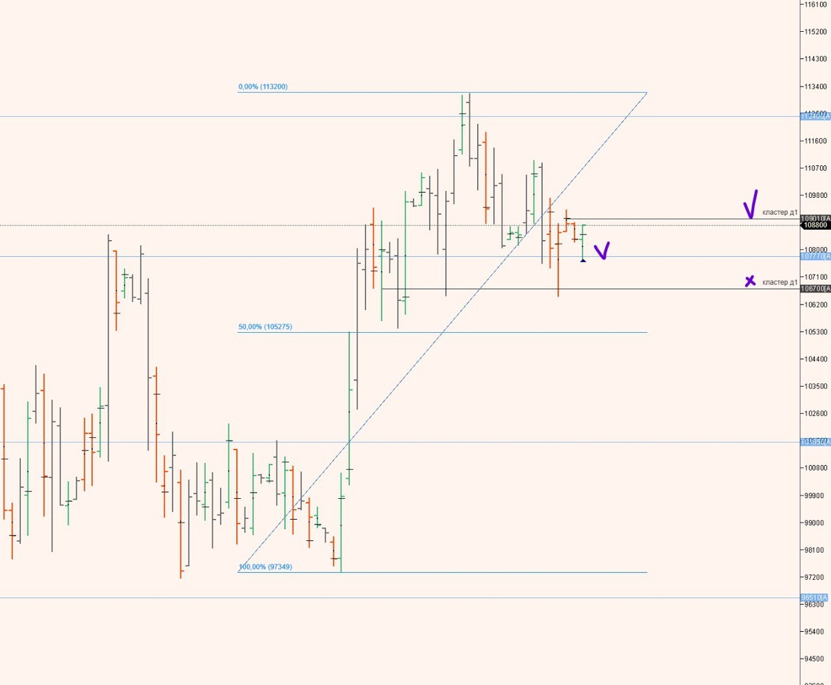 График Ри, тф 1 день. Выполнил вход на тесте декларационного уровня, эти уровни хорошо работают. Кластер ниже уже закрыт. Выше есть недавно сформированный кластер, он будет первой целью. Сигналов от системы пока не поступало, как что появится - сообщу😉