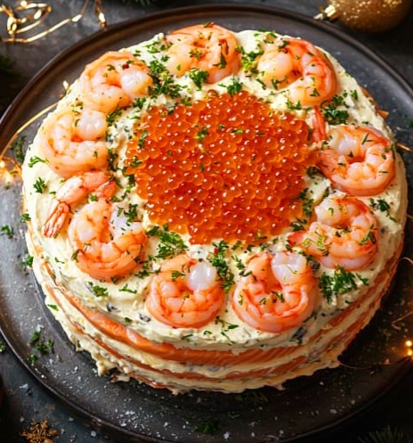 Понадобится: 2 отварные картофелины, 2 яйца вкрутую, 150 г слабосоленой красной рыбы (семга, форель), 1 свежий огурец, 150 г отварных очищенных креветок, 2 плавленых сырка, майонез. На большое плоское блюдо выложите первый слой из тертого отварного картофеля и слегка смажьте его майонезом. Вторым слоем распределите