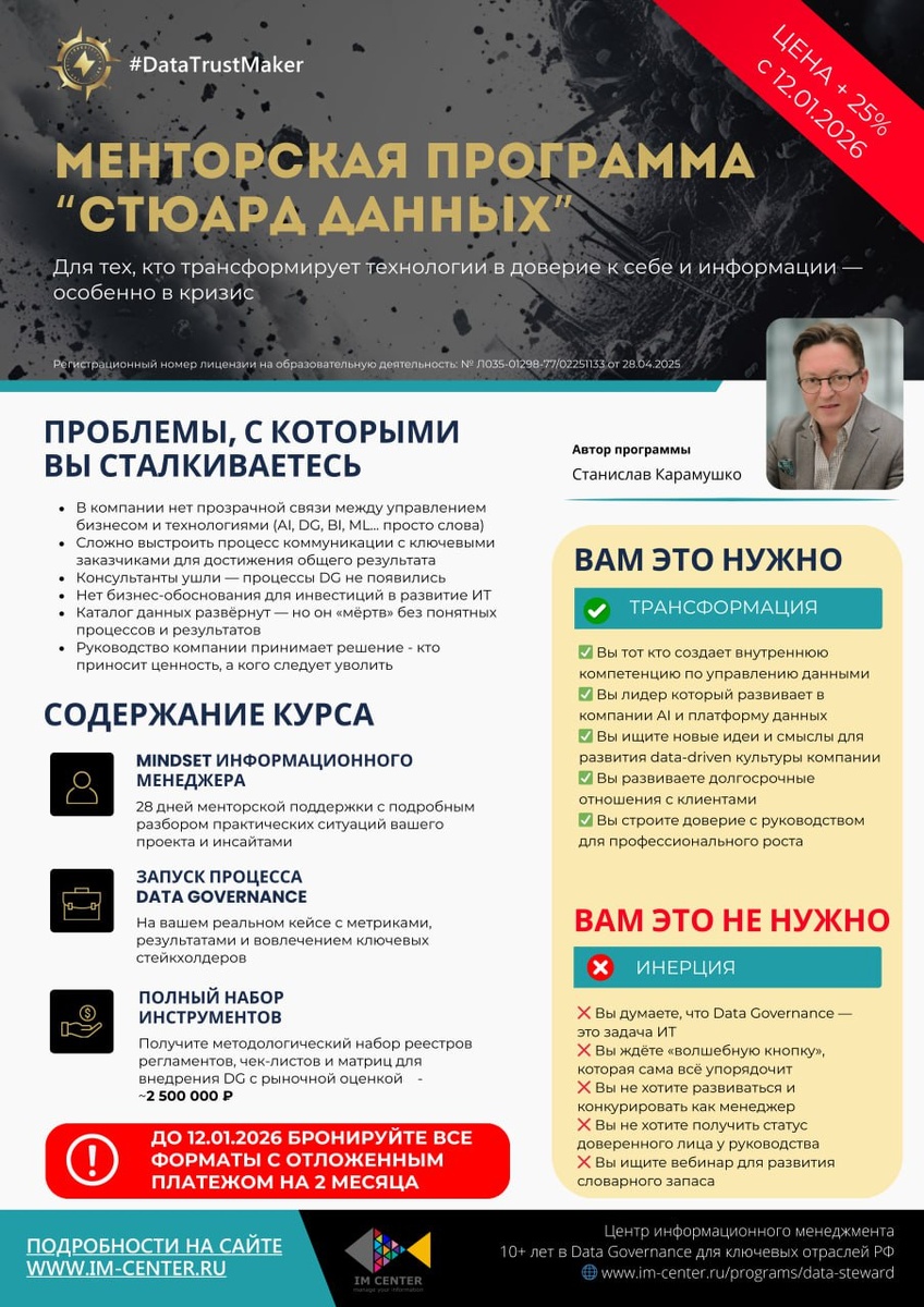 %👉 ⚡️Если вы рассматриваете участие — сейчас еще есть время зафиксировать текущую цену. 🗓 До 12.01.2026 вы можете забронировать любой формат с отложенным платежом на 2 месяца — без предоплаты, без рисков. 👉 Выберите свой формат: 1️⃣ Индивидуальный менторинг Проработка вашего кейса: DG-стратегия, внедрение, защита перед руководством 🔗 https://www.im-center.ru/data-steward-course 2️⃣ Корпоративный формат Для команд: запуск роли Стюарда, построение внутренней компетенции 🔗 https://www.im-center.ru/programs/data-steward 3️⃣ Командный Bootcamp 28 дней, 10 артефактов, практика на реальных доменах (банки, нефтегаз, телеком, ритейл...) 🔗 https://www.im-center.ru/data-steward-bootcamp 4️⃣ Специальный проект с Arenadata Catalog Внедрение процессов и ролевой модели DG после развертывания технического решения 🔗 https://www.im-center.ru/data-manager-arenadata-catalog 📌 Все форматы включают: — Сертификат повышения квалификации (Лицензия на образовательную деятельность № Л035-01298-7