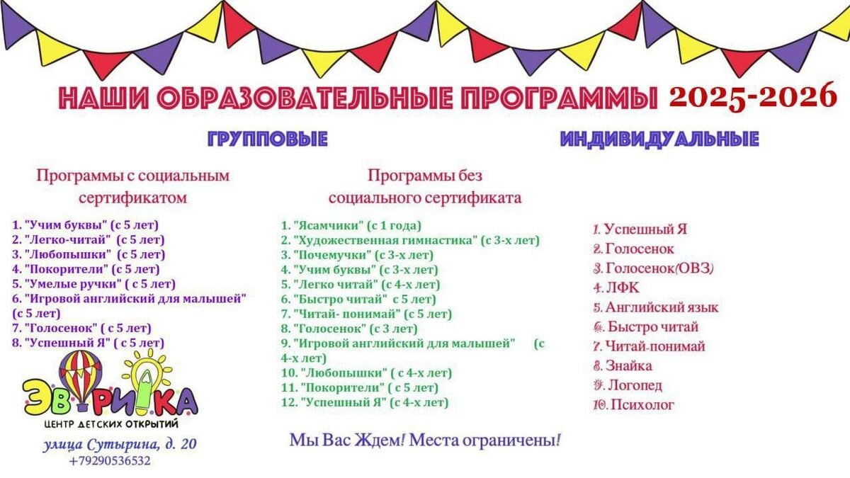 ". Стоимость сертификата на 2026 год 15190 руб. Для того, чтобы использовать сертификат на оплату наших программ нужно: 1. Подать заявку. Во всех программах выбрать группу 26/1. 2. Подойти в центр "Эврика" по адресу ул. Сутырина, д. 20, для заключения договора до 26 декабря 2025 года. Количество сертификатов ограничено. Поспешите! https://р52.навигатор.дети/directivities?organizer=2036