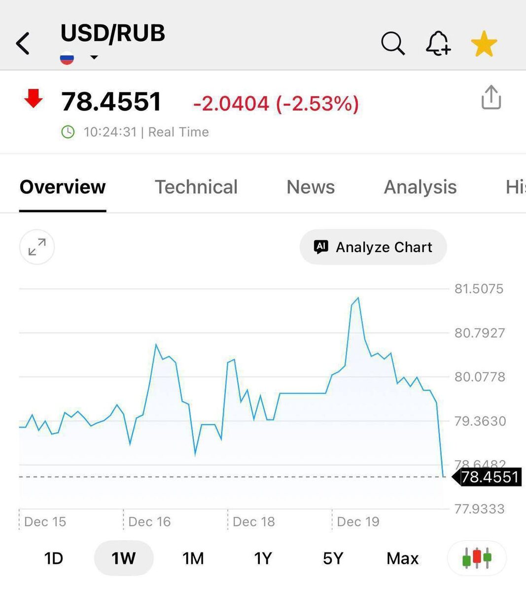 💵 Доллар на бирже резко просел и опустился до 78 рублей.