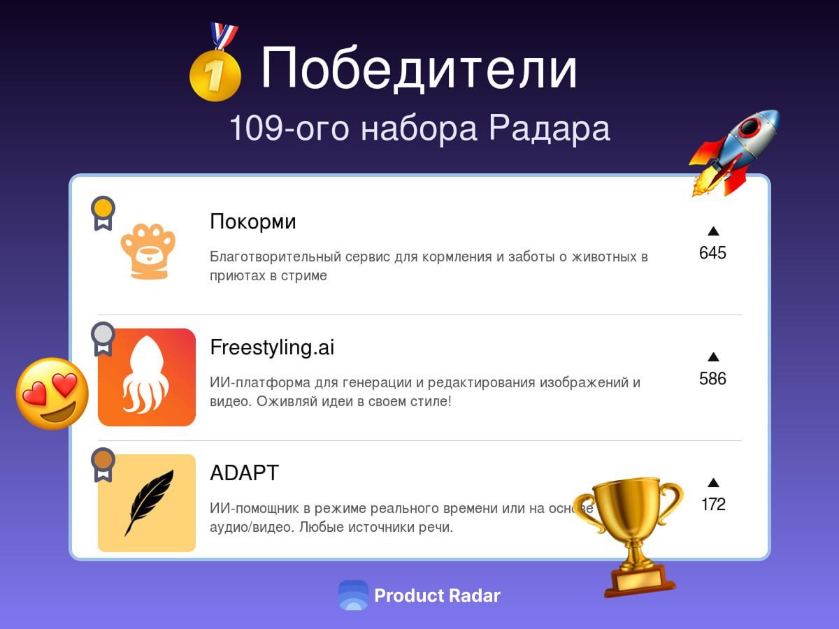 109-й набор 🥇 Покорми Благотворительный сервис для кормления и заботы о животных в приютах в стриме 🥈 Freestyling.ai ИИ-платформа для генерации и редактирования изображений и видео. Оживляй идеи в своем стиле! 🥉 ADAPT ИИ-помощник в режиме реального времени или на основе готовых аудио/видео. Любые источники речи. Новый раунд стартапьих бегов и новые проекты уже на вашем Радаре!🌚 — ⭐️ Вы можете Поддержать Радар и получить значок «Друг Радара», а также доступ в закрытый канал и к базе знаний для развития стартапа с нуля — 📤СТАВЬТЕ РЕАКЦИИ: «🎉» – Урааааа! «🔥» - Все молодцы! «❤️» - Я голосовал(-а) за победителя🐱
