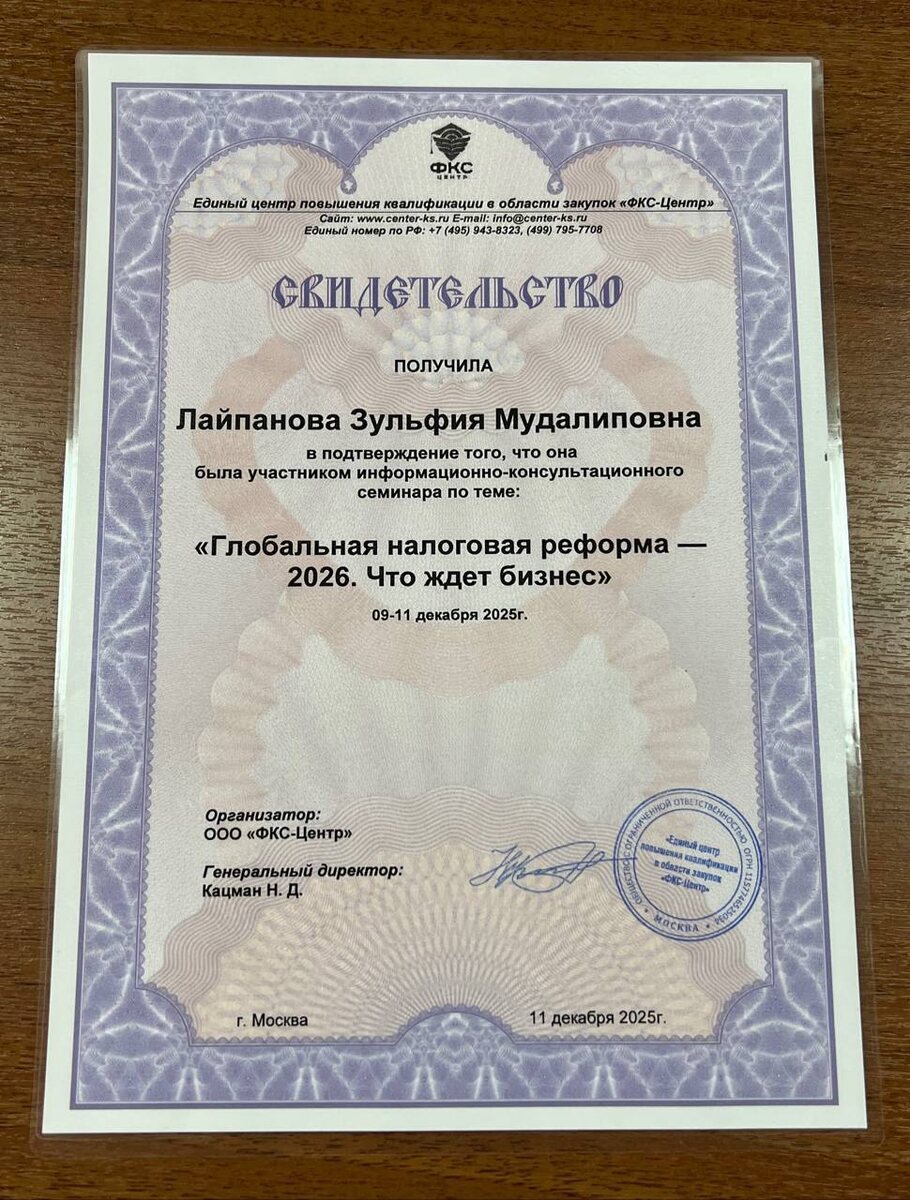 Накануне доцент кафедры «Бухгалтерский учет» Лайпанова Зульфия Мудалиповна приняла участие в информационно-консультационном семинаре по теме «Глобальная налоговая реформа-2026. Что ждет бизнес». Мероприятие проходило в г. Москва и стало отличной возможностью быть в курсе последних изменений в налоговой сфере. Повышение квалификации преподавателей вузов — неотъемлемая часть непрерывного профессионального развития. Такие курсы позволяют обновлять теоретические знания и совершенствовать практические навыки, осваивая современные методы решения профессиональных задач. Это особенно важно для поддержки высокого уровня подготовки студентов и соответствия требованиям рынка труда. Зульфия Мудалиповна поделилась с коллегами важной информацией о том, какие изменения ожидают предприятия в будущем году и как они отразятся на организации бухгалтерского учета и подготовке бухгалтерской (финансовой) отчетности. «Такие мероприятия способствуют развитию профессиональных компетенций и позволяют препода