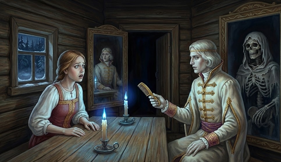 Эта история — одна из самых известных «святочных быличек». Её рассказывали шёпотом, чтобы не привлечь лишнего внимания тех, кто бродит за окном в эти тёмные ночи. В одной заснеженной деревне жила красавица Дарья. Была она смелее всех подруг и решила в самую «страшную» ночь Святок узнать, кто станет её судьбой. Старики предупреждали: «Не играй с зеркалами, Даша, в них не только будущее, в них Тень живёт». Но любопытство пересилило страх. В полночь, когда луна скрылась за тучами, Дарья ушла в старую баню на краю оврага. Поставила два зеркала друг против друга, зажгла две свечи и прошептала заветное: «Суженый-ряженый, приди ко мне ужинать». Тишина в бане стала такой густой, что слышно было, как бьётся её собственное сердце. Вдруг пламя свечей качнулось и посинело. В глубине зеркального коридора показалась тень. Она приближалась медленно, обретая черты высокого мужчины в богатом кафтане. Дарья замерла. Гость вышел из зеркала — он был прекрасен, но лицо его казалось бледным, как первый сн