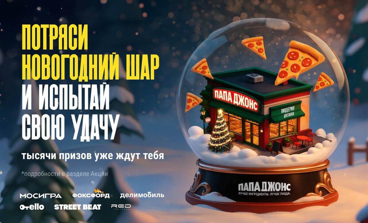 ✨ 🎁 Теперь у нас на сайте и в мобильном приложении есть волшебный шар, который дарит приятные подарки от партнёров Просто авторизуйся, потряси шар и забирай свой приз 🥳 Трясти шар можно один раз в день, и каждый раз тебя ждет что-то новое Заходи почаще и собирай свою коллекцию зимних чудес 👇🏻 papajohns.ru/novosibirsk