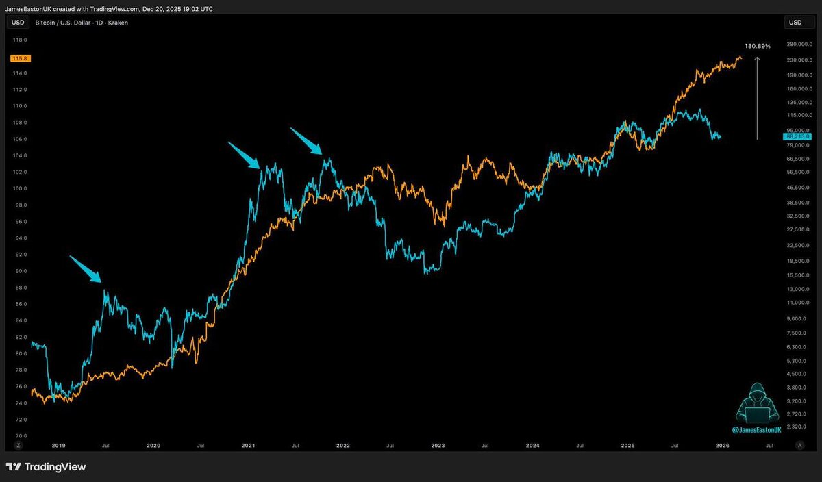 Сейчас любят говорить: биткоин «раскоррелировался» с глобальной M2. Мол, раньше рос вместе с ликвидностью, а теперь — нет. Формально — да, на графике это видно. Линии разошлись. И именно в этот момент начинается подмена смысла. Про «раскорреляцию» обычно говорят только тогда, когда она вниз. Но почему-то забывают, что когда биткоин входит в фазу бега, он точно так же раскоррелируется — только вверх. И это уже становится «шумом», «аномалией», «неустойчивым ростом». Хотя по факту — это одна и та же механика. Биткоин не зеркалит M2 день в день. Он живёт с лагом, с перекосами, с фазами сжатия и расширения. Иногда он отстаёт. Иногда убегает вперёд. Но на дистанции направление совпадает. Самое интересное начинается не тогда, когда линии расходятся, а когда «челюсти» начинают сходиться обратно. И вот тогда рынок внезапно вспоминает про ликвидность, про циклы, про то, что «мы же это уже видели». Отдельный момент, который многие игнорируют: глобальная M2 всё ещё растёт. Я не утверждаю,