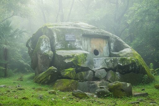 Иду я по этой тропе, смотрю на указатели, и думаю: "Ну сейчас будет разочарование — какой-то камушек размером с холодильник и толпы китайских туристов". Выхожу на поляну — и офигеваю. Передо мной здоровенный блок песчаника, метра 3 в высоту, с круглой дыркой диаметром 40 см. И понимаешь, что это не реконструкция, не новодел — это РЕАЛЬНО ему 5000 лет.