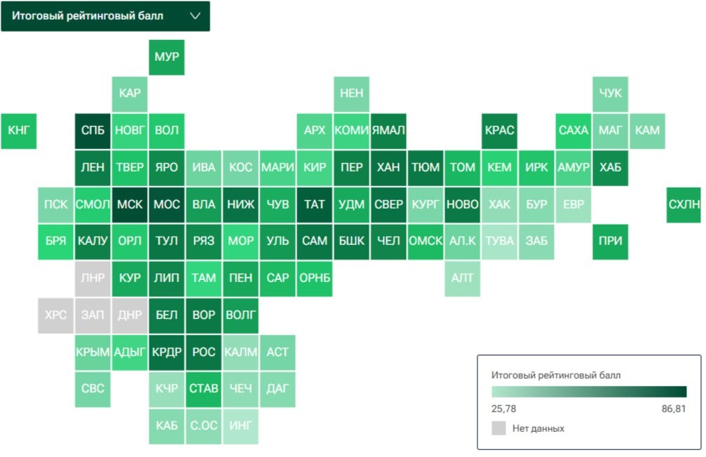 Регион занял 17-е место в итоговом рейтинге регионов, набрав 64,78 балла, сообщает РИА Рейтинг. Среди субъектов Центрального Черноземья Белгородская область уступила первое место Воронежской области, которая с результатом 65,65 балла заняла 15-ю позицию. Липецкая область расположилась на 21-м месте с 61,84 балла. Курская область заняла 35-ю строчку, набрав 57,79 балла. Худший результат в Черноземье продемонстрировала Тамбовская область, заняв 52-е место с 53,21 балла. В числе лидеров среди регионов РФ оказались Москва с 86,81 баллами, Санкт-Петербург — 85 баллов и Московская область — 81,88 балла. Завершают список Тыва и Ингушетия с результатами 27,33 и 25,78 балла соответственно. Подписаться на 🗞🗞 | Поддержать бустом