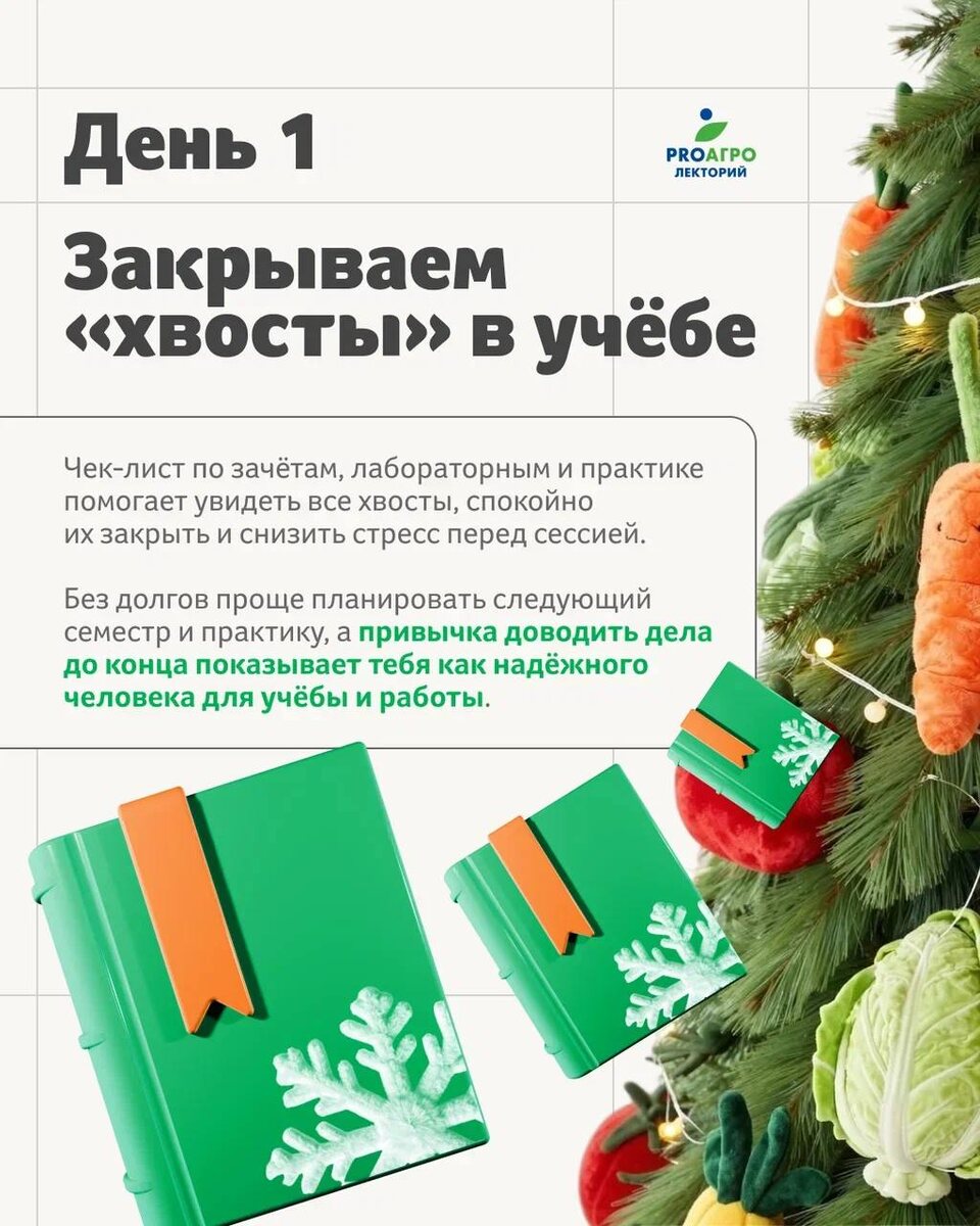 🧦 Открываем первое окошко нашего предновогоднего студенческого челленджа! Вместо шоколадок — полезные шаги, которые помогут войти в новый семестр без хаоса, долгов и спешки. Каждый день — маленькое действие, которое делает твою учёбу и карьеру чуть проще. Сегодня стартуем с главного — разбираем хвосты по учёбе, чтобы спокойно закрыть год и освободить голову перед праздниками. 🔔Лайфхаки по организации задач: 1️⃣Собери всё в одном месте Запиши каждый хвост: зачёты, лабы, отчёты, практику. Когда всё перед глазами — становится легче понять, с чего начать. 2️⃣Разбей задачи по времени Сделай две категории: — «до 30 минут» — быстрые, лёгкие задачи; — «подольше» — то, что требует концентрации. Так проще планировать и не перегружаться. 3️⃣Начни с простого Закрой 2–3 короткие задачи — почувствуешь прогресс, который даст энергию двигаться дальше. 4️⃣Правило «15 минут» Поставь таймер и поработай всего 15 минут. Почти всегда ты продолжишь — начать труднее, чем продолжить. Завтра откроем сл