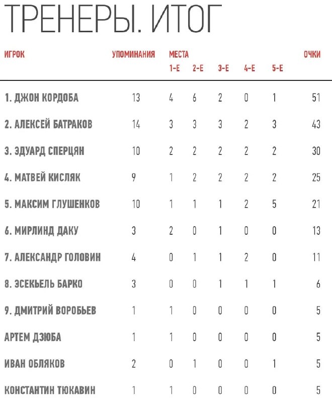 Он набрал 13 баллов. На первое место его поставили Рахимов и Талалаев, на третье место - Биджиев. Выше Даку только Кордоба, Батраков, Сперцян, Кисляк и Глушенков. В общем списке наш форвард также шестой. ❤️ Злобный Рубин ❤️