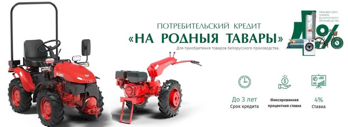 Хотите мини-трактор МТЗ “Беларус” в кредит всего под 4% годовых? Или присматриваете мотоблок МТЗ для деревни — на таких же выгодных условиях? Это реально при покупке техники Сморгонского агрегатного завода (предприятие входит в состав холдинга «Минский тракторный завод»). ✅ Льготный кредит оформляется в Беларусбанке: срок — до 3 лет ставка — фиксированные 4% годовых сумма — до 12 000 BYN (примерно ≈ 340 000 RUB, зависит от курса) Программа господдержки «На радныя тавары» действует до 31.12.2025 и создана для поддержки спроса на белорусские товары. Отдельный плюс: оформить кредит могут не только граждане РБ, но и граждане РФ, которые постоянно проживают в Беларуси и имеют подтверждённый доход в РБ или РФ. Как вам условия — воспользовались бы? Напишите в комментариях 👇😎 Условия кредитования и перечень документов уточняйте в Беларусбанке — решение принимает банк. Точный список зависит от банка и ситуации, но чаще всего: Для более подробной информацией - наберите нам 8(029)-615-88-00