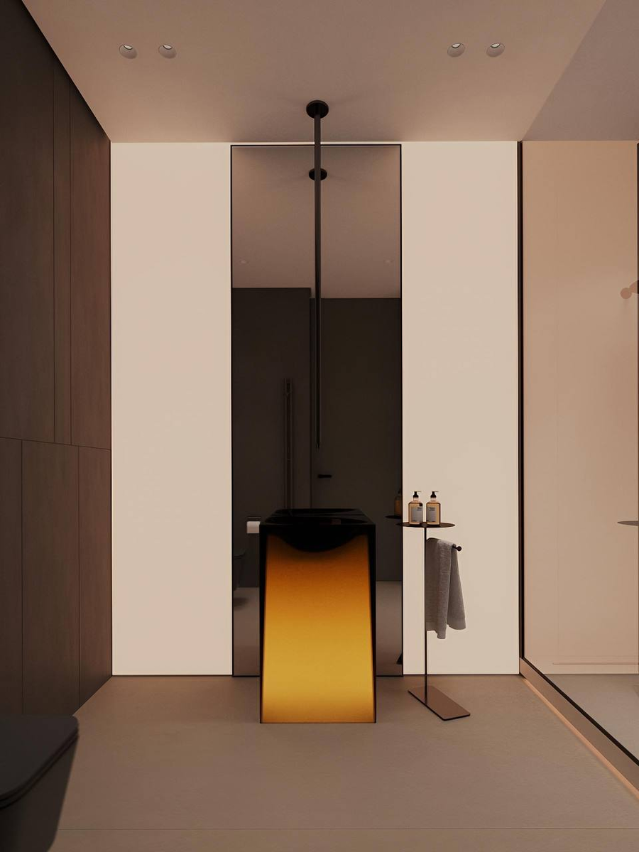 Монохромный интерьер комнаты создаёт обрамление, интерьер предельно спокойный, чтобы не спорить с центром композиции. Даже система хранения умело спрятана — так, чтобы ничто не создавало визуального шума. Душевая — продолжение общего настроения: прозрачное стекло, деликатная скрытая подсветка, идеальная геометрия.