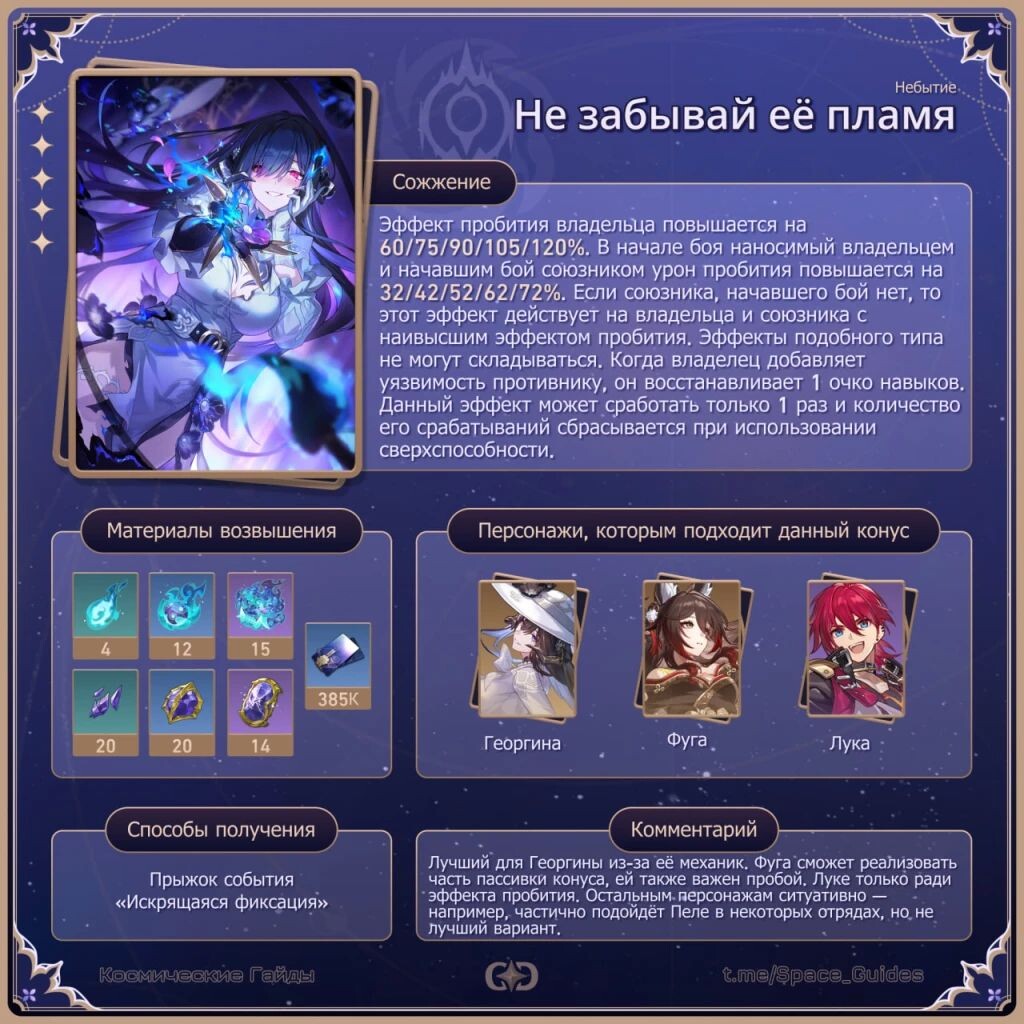 ㅤВ версии 3.8 к получению стал доступный новый персонаж — Георгина. Она является последовательницей Пути Небытия и заняла важное место в отрядах пробития. Насколько же ей важен её Световой конус и кому ещё он может подойти? ㅤ«Не забывай её пламя» — сигнатурный Световой конус Георгины. ㅤС подробным описанием пассивного таланта и необходимыми материалами можно ознакомиться на изображении: ㅤПовышает эффект пробития на 60/75/90/105/120%. В начале боя урон, наносимый владельцем и начавшим бой персонажем, повышается на 32/42/52/62/72%. При отсутствии персонажа, начавшего бой, эффект действует на владельца и союзника с самым высоким эффектом пробития. Данные эффекты не складываются. При добавлении владельцем уязвимости противнику восстанавливается 1 очко навыков, эффект срабатывает 1 раз и сбрасывается после применения сверхспособности. ㅤСветовой конус «Не забывай её пламя» будет доступен в первой половине версии 3.8. ㅤДалее конус также будет доступен для получения во время последующих рерано