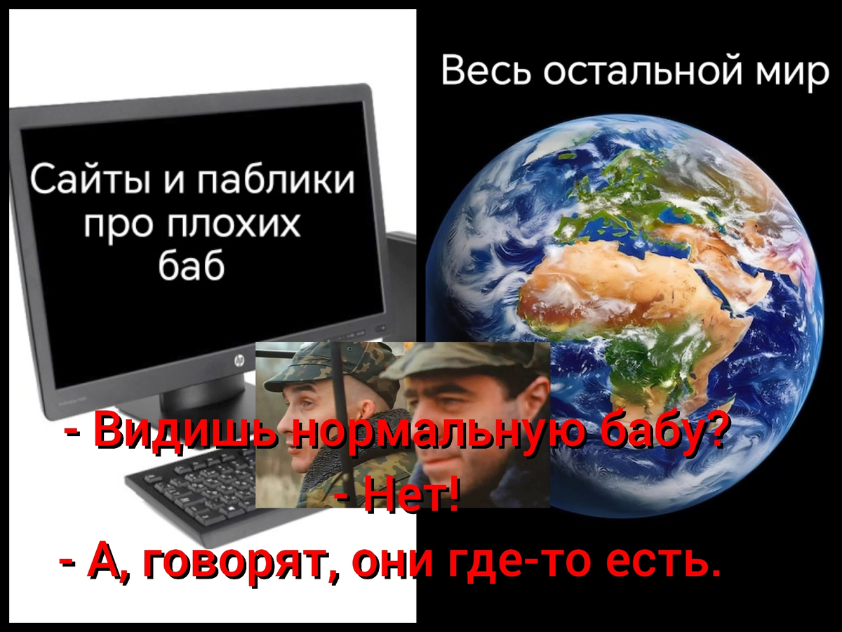 Вчера в очередной раз в ленте наткнулся на то, как один из моих вк-друзей цитирует посты очередной из, к сожалению, теперь уже многих групп, где админ и подписанные на группу мужики подогревают друг другу ненависть к женщинам. Женщины такие, сякие, манипулируют, увиливают, при этом погловно врут и спят с кем попало. Ну, может, не все, но почти все. То есть, чтобы вы понимали, эти мужчины весь свой потенциал, всё своё время, силы, эмоции и ум задействуют для того, чтобы находить примеры плохих женщин и обмусоливать их в группе.