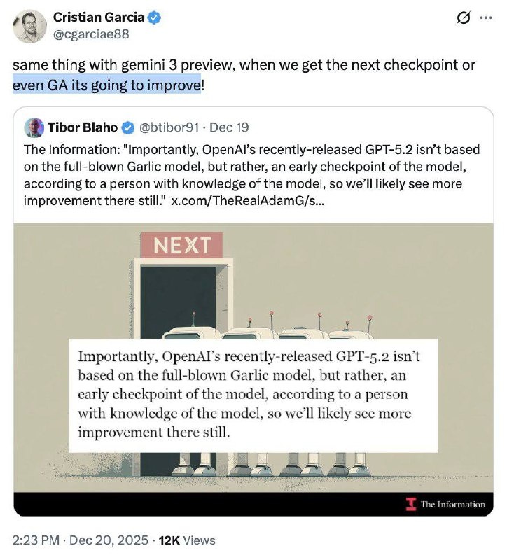 По данным The Information, GPT‑5.2 не является финальной версией Garlic, а представляет собой ранний, недообученный чекпоинт. Это указывает на скорое дополнительное улучшение качества модели при выпуске следующего чекпоинта. То же относится к Gemini 3 Pro: модель рассматривают как промежуточный чекпоинт её линейки, и ожидается дальнейшее развитие до следующего релиза или доступности в general availability. — "С Gemini 3.0 — та же история. Скоро мы получим следующий чекпоинт или даже general availability, и она улучшится", — Christian Garcia, Google. • GPT‑5.2 — ранний недообученный чекпоинт Garlic • Gemini 3 Pro — промежуточный чекпоинт; следующий чекпоинт или GA ожидаются в ближайшее время Ожидается ещё один чекпоинт и заметное повышение качества моделей. @All_hot_news