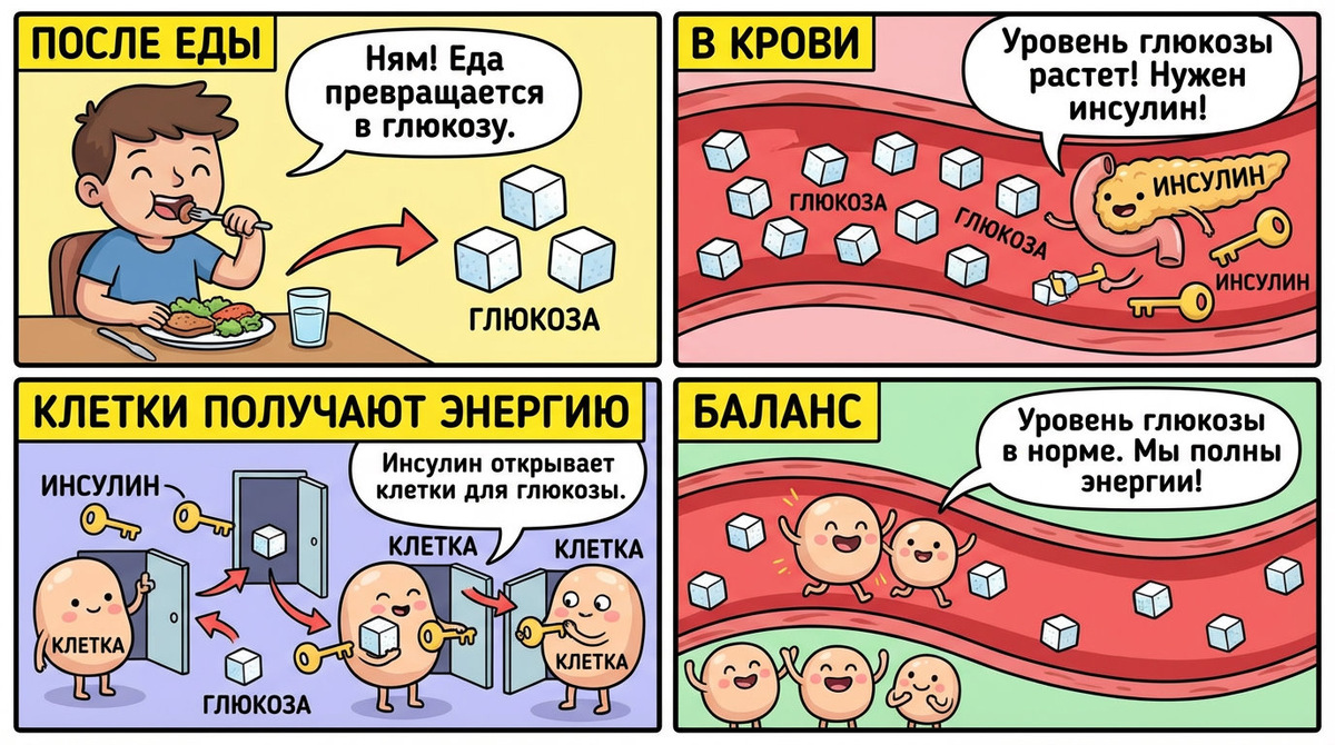 Глюкоза — это сахар, который циркулирует в крови и служит топливом для мозга, мышц и большинства органов. Чтобы глюкоза попала из крови в клетки, нужен гормон инсулин, который вырабатывает поджелудочная железа.