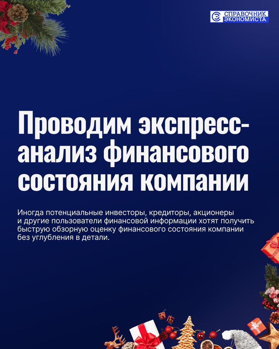 Проводим экспресс-анализ финансового состояния компании Иногда потенциальные инвесторы, кредиторы, акционеры и другие пользователи финансовой информации хотят получить быструю обзорную оценку финансового состояния компании без углубления в детали. Для этого проводят экспресс-анализ, который осуществляется по открытым данным бухгалтерской (финансовой) отчетности. Из статьи, опубликованной в журнале «Справочник экономиста», вы узнаете: ✨ Зачем нужен экспресс-анализ финансового положения? ✨ Из каких этапов состоит такой анализ? ✨ В чем заключаются особенности его проведения? 📍 Скачать статью можно по ссылке