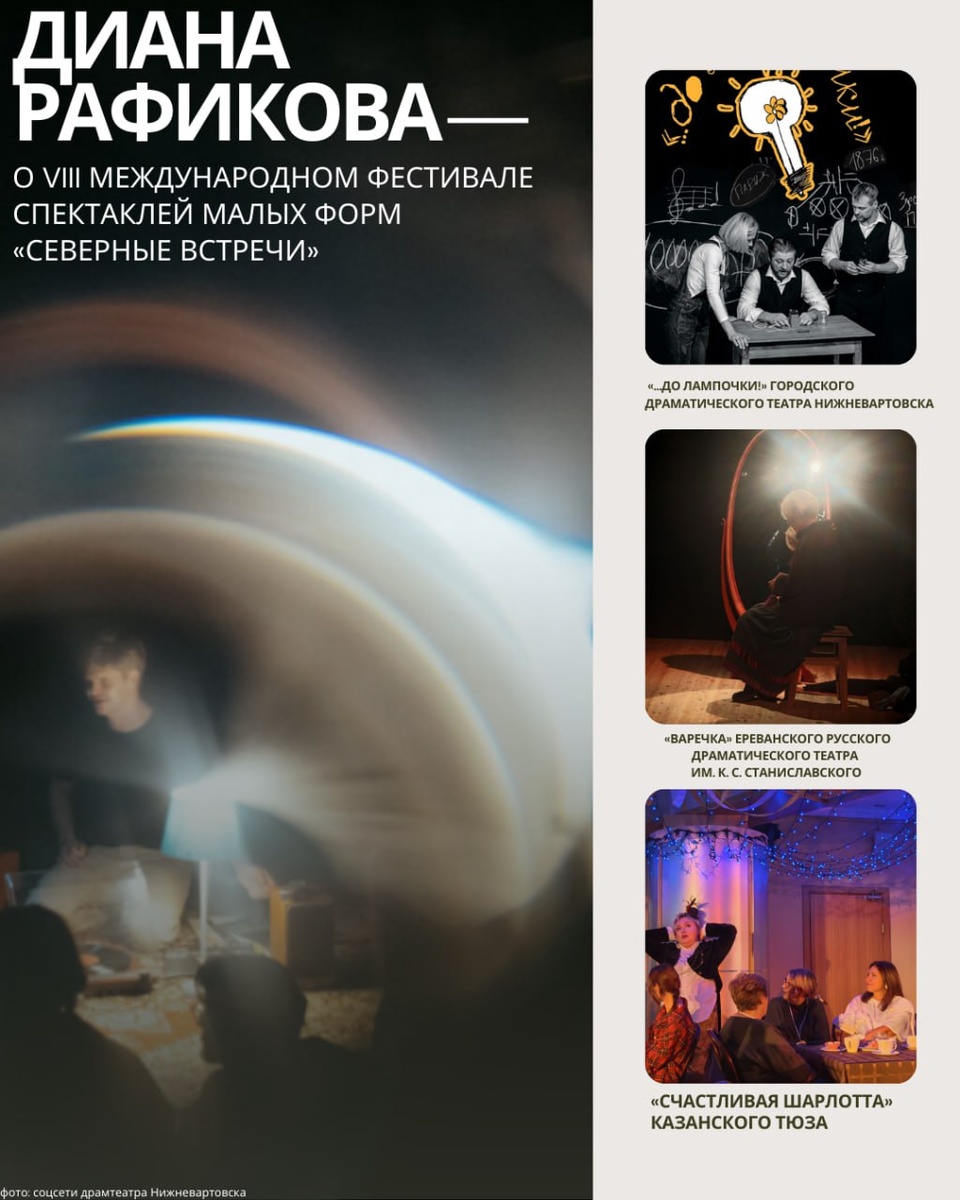 фестиваля спектаклей малых форм «Северные встречи». В программу вошли спектакли из Армении и Беларуси, а также театров Казани, Верхней Пышмы, Кемерова и Санкт-Петербурга. На фестивале побывала Диана Рафикова. Фестиваль «Северные встречи» собрал в программе спектакли из разных театров, стран и городов. Объединяет их то, что в каждом центром становится герой или героиня с насущными, понятными зрителю чувствами и мыслями. Пронзительно и остро театры задались вопросом о месте современного человека в мире, и это придало историям общечеловеческое звучание. Из текста вы узнаете: 👉о спектакле «…до лампочки!» Городского драматического театра Нижневартовска и театральном сторителлинге об изобретении электричества; 👉о моноспектакле «Варечка» Ереванского русского драматического театра им. К. С. Станиславского — истории сломанной балетной судьбы; 👉о спектакле «Счастливая Шарлотта» Казанского ТЮЗа и новом взгляде на чеховскую героиню; 👉о постановке «Без пудры» Могилёвского областного драматич