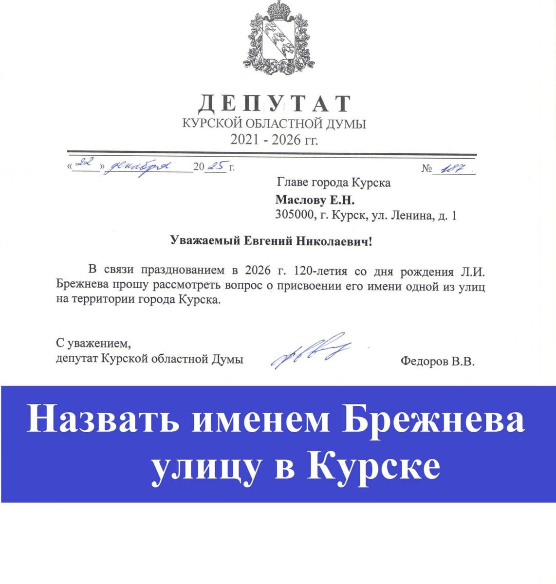Он предложил назвать одну из улиц Курска именем Леонида Брежнева. - Соответствующее предложение в адрес главы Курска я уже направил, - рассказал депутат Курской облдумы Владимир Фёдоров. - Напомню, что в 2026 году планируется празднование 120-летия со Дня рождения многолетнего руководителя страны, судьба которого неразрывно связана с нашим регионом. В Курске Леонид Брежнев обучался в землеустроительном техникуме, куда поступил в 1923 году. Получал повышенную государственную стипендию. Здесь же, в Курске, он познакомился со своей будущей супругой, которая училась в медицинском техникуме.
