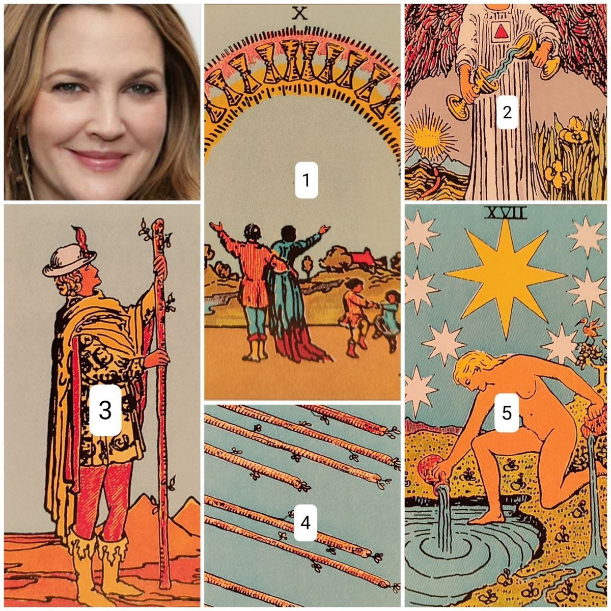 Друзья, сегодня хочу показать, как работают карты Таро, но в необычном формате. Сегодня героиня моего расклада - голливудская "звезда" Дрю Бэрримор. Это неспроста, потому что Дрю сама частенько обращается к картам Таро. Сначала я составила план вопросов. Сделала расклад. А затем покопалась в интернете и нашла биографию этой актрисы. И решила сопоставить свою трактовку расклада и рассказ о реальной жизни Дрю Бэрримор. Вот что получилось. 🔢Точка А. Десятка кубков - родилась в крепкой, полной семье. ⬇️ Дрю Бэрримор родилась в семье известных актеров. С раннего возраста она в мире кино. В 7 лет снялась в фильме «Сияние» Стэнли Кубрика и быстро стала известной. (Как видим, действительно всё складывается, как нельзя удачно). 🔢Что мешало достичь результата? Умеренность - карта баланса и меры,связана с жидкостями. ⬇️ Эту меру Дрю как раз поначалу не смогла соблюдать. У неё были проблемы с алкоголем, да и не только. 🔢Что она сделала для получения результата? Паж жезлов - говорит об
