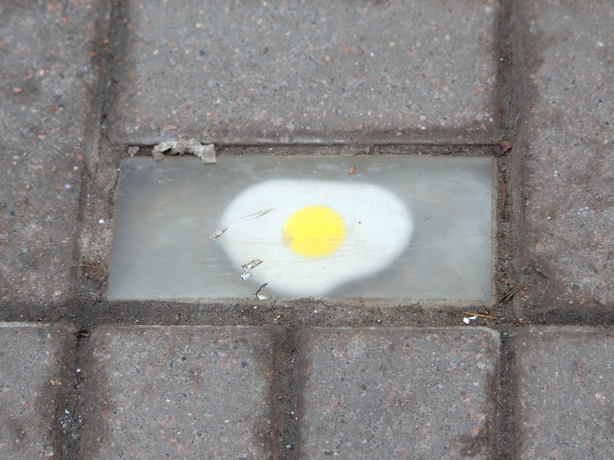 Во время прогулки по Санкт-Петербургу можно смотреть не только на красивые фасады, а ещё и себе под ноги. В некоторых местах Петербурга, прямо в плитке, есть интересные артефакты. Кто их туда вмонтировал - загадка. По смыслу они обычно подходят к окружающей местности. К примеру, у Андреевского рынка (на Василеостровской) - яичница (сейчас там фудкорт- еда со всего света).