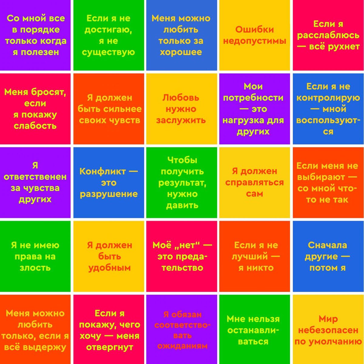 Привет, Талантливые! А вы когда-нибудь выигрывали в игру, в которой совсем не хочется быть чемпионом? Сегодня хочу поделиться с вами довольно грустными и одновременно важными результатами моей игры в психологическое бинго. Вот этот на скрине. Моё бинго. И да… я абсолютный чемпион. Из 25 клеток страх стыд вина подавленный гнев когнитивные искажения запреты самообесценивание и всё это «добро» когда-то было у меня. Всё. 25 из 25. И я помню это ощущение. Когда вроде бы живёшь, работаешь, улыбаешься. А внутри как будто постоянно что-то зажато. Тело напряжено. Голова всё время доказывает, что «со мной что-то не так». И вот здесь важный момент, ради которого я вообще это пишу. Сегодня из этих 25 пунктов ко мне не относится ни один. Ноль. Пустое бинго. Не потому что я «просветлённый». И не потому что «мне повезло». А потому что это был долгий психологически-ментальный путь. Шаги назад. Сопротивление. Злость. Стыд за стыд. И снова выбор идти дальше. Я уже делился инструментами, которые мне пом