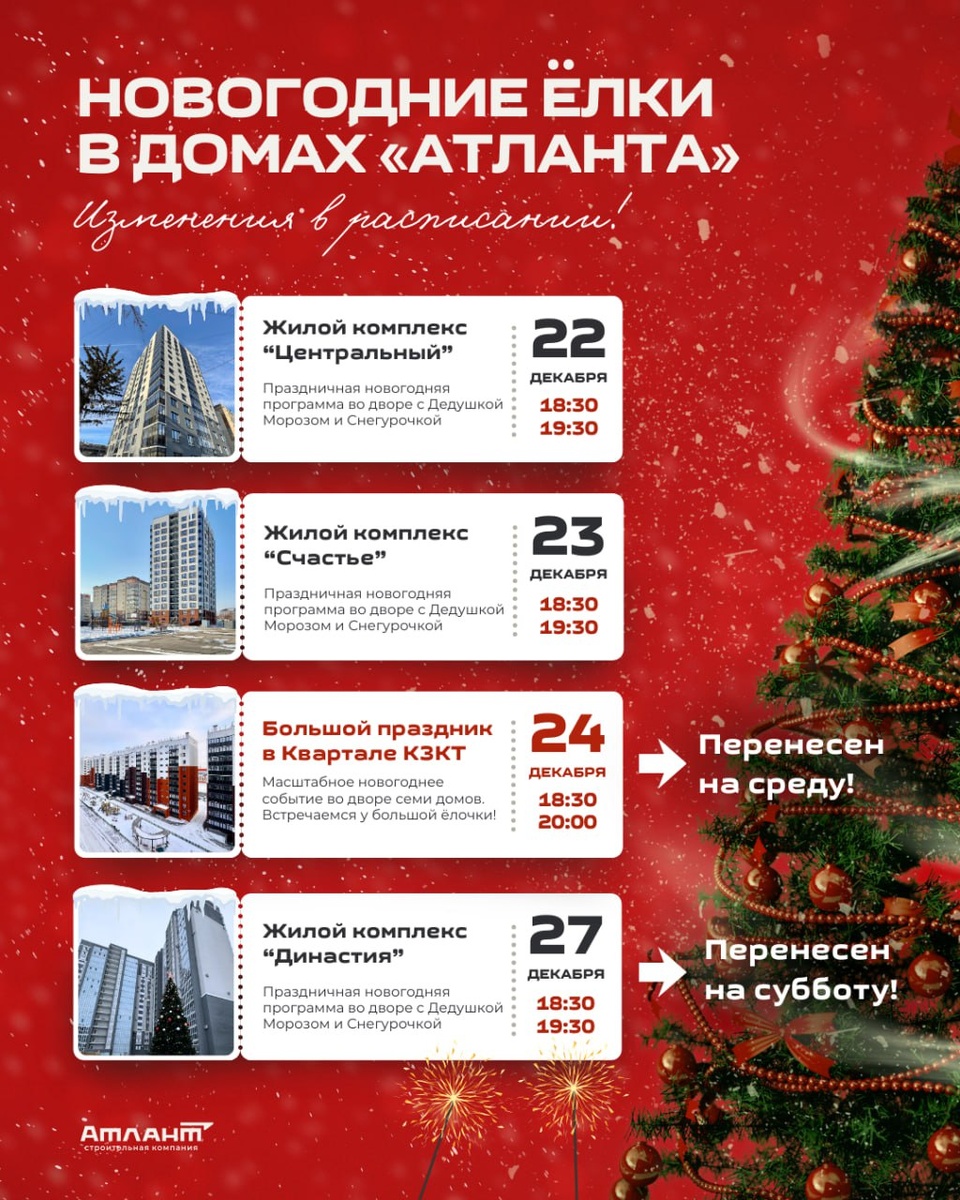 Из-за холодной погоды в четверг большой праздник в Квартале КЗКТ переносим на день раньше — на среду, 24 декабря. Время остается прежнее: с 18:30 до 20:00. Праздник в жилом комплексе «Династия» пройдет в субботу, 27 декабря. Жилым комплексам «Счастье» и «Центральный» повезло с погодой больше 😅, тепло и снежок —поэтому всё без изменений. 🎁 Сегодня на Куйбышева, 141 стартует первое поздравление Дедушки Мороза для жильцов. Ждем всех на игровой площадке на верхнем уровне паркинга. Вход через калитку по лестнице будет открыт! До встречи на празднике ❄️