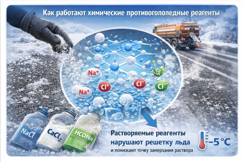 Почему соль плавит лёд: химия противогололёдных реагентов