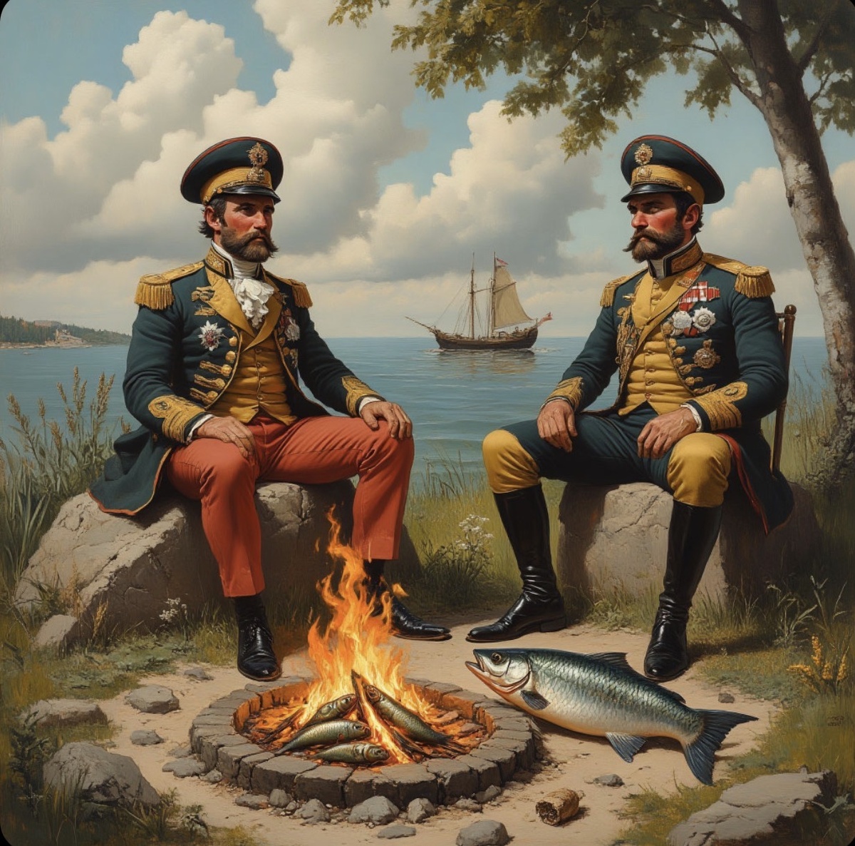 ΠΠ° ΠΎΡΡΡΠΎΠ²Π΅ ΠΎΠ½ΠΈ Π½Π°Ρ ΠΎΠ΄ΡΡ ΠΌΡΠΆΠΈΠΊΠ°, ΠΊΠΎΡΠΎΡΡΠΉ Π±Π΅Π· ΠΎΡΠΎΠ±ΡΡ ΡΡΠΈΠ»ΠΈΠΉ Π»ΠΎΠ²ΠΈΡ ΡΡΠ±Ρ, Π΄ΠΎΠ±ΡΠ²Π°Π΅Ρ ΠΎΠ³ΠΎΠ½Ρ, Π³ΠΎΡΠΎΠ²ΠΈΡ ΠΏΠΈΡΡ ΠΈ ΡΡΡΠΎΠΈΡ ΠΆΠΈΠ»ΡΡ. ΠΠ΅Π½Π΅ΡΠ°Π»Ρ ΠΏΡΠΈΠΊΠ°Π·ΡΠ²Π°ΡΡ Π΅ΠΌΡ ΡΠ°Π±ΠΎΡΠ°ΡΡ, ΡΠ°ΠΌΠΈ ΠΆΠ΅ ΠΏΡΠΎΠ΄ΠΎΠ»ΠΆΠ°ΡΡ ΡΠ°ΡΡΡΠΆΠ΄Π°ΡΡ ΠΎ ΡΠ»ΡΠΆΠ±Π΅ ΠΈ ΡΠΈΠ½Π°Ρ . ΠΠΎΡΠ»Π΅ Π²ΠΎΠ·Π²ΡΠ°ΡΠ΅Π½ΠΈΡ Π½Π° ΡΠΎΠ΄ΠΈΠ½Ρ Π³Π΅Π½Π΅ΡΠ°Π»Ρ ΠΏΠΎΠ»ΡΡΠ°ΡΡ Π½Π°Π³ΡΠ°Π΄Ρ, Π° ΠΌΡΠΆΠΈΠΊ β ΡΠΈΠΌΠ²ΠΎΠ»ΠΈΡΠ΅ΡΠΊΡΡ ΠΏΠΎΠ΄Π°ΡΠΊΡ.