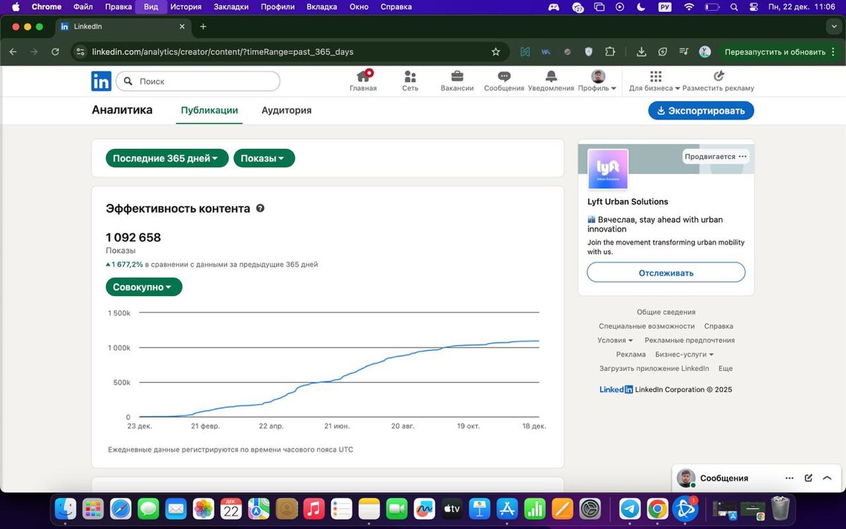 :) Хоть в тик-ток переходи, вещать для молодежи про поиск работы. За последние 12 месяцев LinkedIn дал мне чуть больше миллиона показов, несколько тысяч реакций, сотни сохранений и пересылок. Графики выглядят красиво, особенно если смотреть на них задним числом 💕 Спасибо что читаете и участвуете в обсуждениях👀
