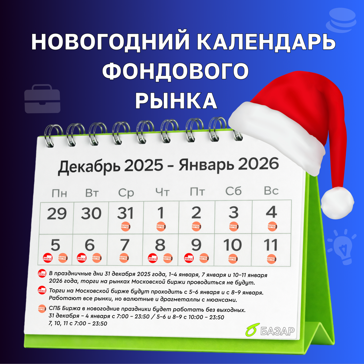 Новогодние каникулы в этом году продлятся 12 дней - с 31 декабря 2025 года по 11 января 2026 года. Первый рабочий день - понедельник, 12 января. Мы подготовили удобный график на каникулы: как будут работать основные площадки в период с 31 декабря по 11 января. 📈Московская биржа В праздничные дни 31 декабря 2025 года, 1–4 января, 7 января и 10–11 января 2026 года торги на рынках Московской биржи проводиться не будут. При этом 5–6 января и 8–9 января 2026 года торги состоятся на: •фондовом рынке,