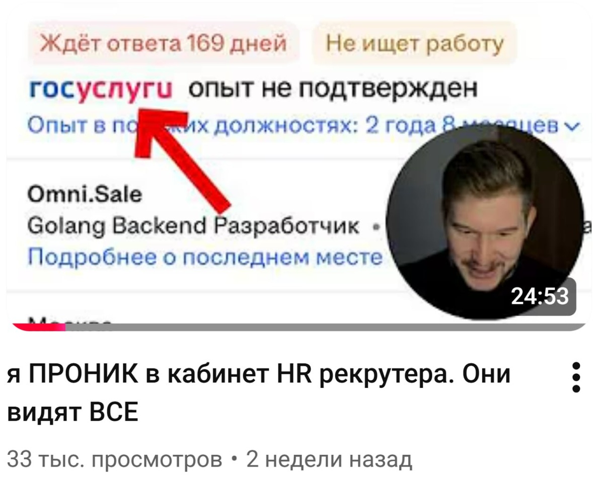 в рекомендательные алгоритмы ютуба ролик по сливу кабинета hh набрал 33к просмотров. Рынок найма уже не будет прежним 🫡 «Я проник в кабинет HR» — видео с таким заголовком набрало 33 000 просмотров. Это один из моих самых успешных роликов на канале, и вот почему это важно не для меня, а для вас 👇 Такие охваты говорят о том, что проблема «слепых» отказов достала всех. Я просто взял и показал техническую изнанку: как именно алгоритмы hh и рекрутеры фильтруют айтишников. Без воды, чисто интерфейс и логика работы системы Теперь 33 тысячи человек знают: — Как обойти автофильтры, — Почему их скипали раньше, — Как заставить алгоритм работать на себя. Я всегда говорю своим ученикам: Чтобы выиграть систему, нужно знать, как она написана. 🔥 — если согласны Теперь это знание доступно всем. Пользуйтесь, пробивайте фильтры и получайте свои офферы. Вы этого достойны 🤝 💬 Нажми для связи со мной по вопросам трудоустройства