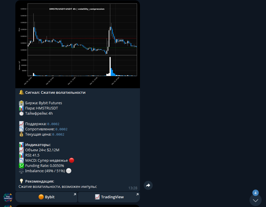 FlatDetector — это современный трейдинговый скриннер, созданный для поиска зон накопления (флэта) на криптовалютном рынке. Инструмент ориентирован на трейдеров, скальперов и тех, кто торгует пробои уровней и выходы цены из консолидации. 👉 Официальный Telegram-бот FlatDetector: 🔗 https://t.me/smart_FlatDetectorBot FlatDetector — это Telegram-скриннер, который автоматически анализирует рынок и находит моменты, когда цена находится во флэте. Флэт — это зона накопления, где рынок сжимается и часто готовится к сильному движению. Вместо того чтобы вручную просматривать десятки графиков, трейдер получает готовые уведомления с уже обработанной информацией прямо в Telegram. 📌 Запуск бота: https://t.me/smart_FlatDetectorBot Скриннер FlatDetector подключается к бирже Binance и анализирует рынок по нескольким ключевым параметрам: ✅ объем торгов ✅ баланс покупателей и продавцов ✅ индикаторы RSI и MACD ✅ зоны поддержки и сопротивления ✅ график цены в момент накопления Все эти данные приходят в ви