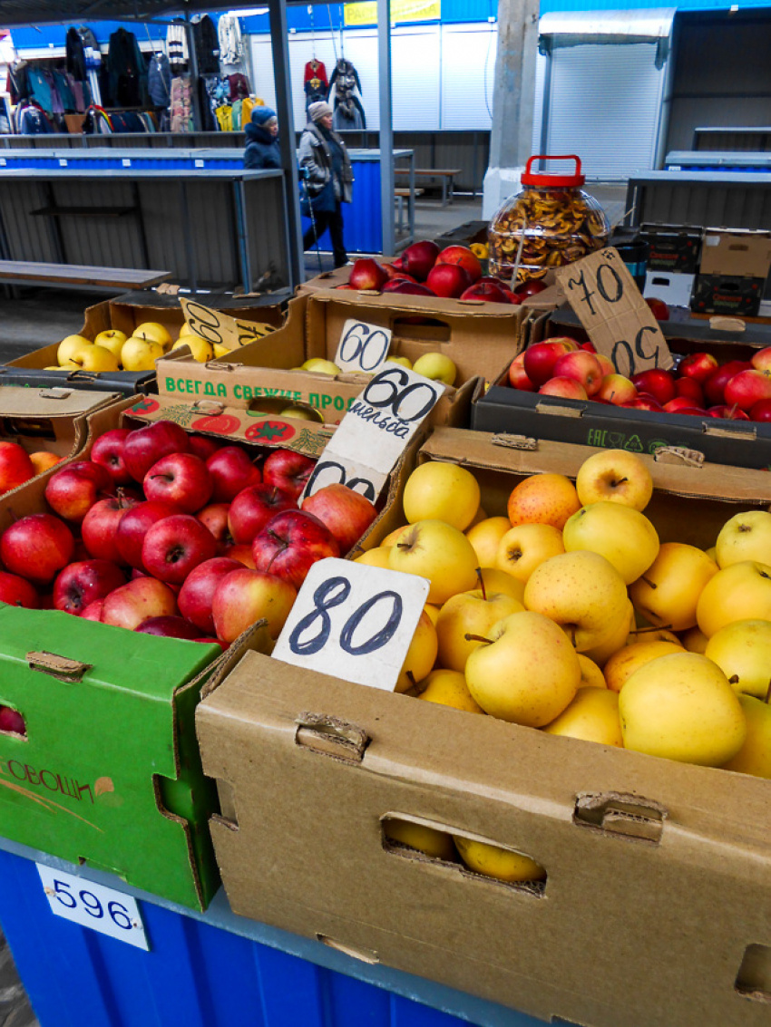 На всех рынках Камышина перед Новым годом держится относительно низкая цена на яблоки. Они стоят меньше 100 рублей за килограмм.