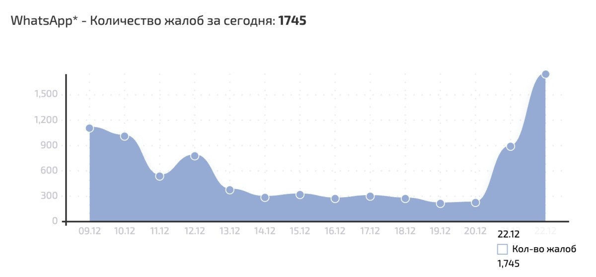 В России жалуются на сбои в работе WhatsApp, принадлежащего запрещённой Meta: на «Сбой.рф» уже больше 1700 жалоб.