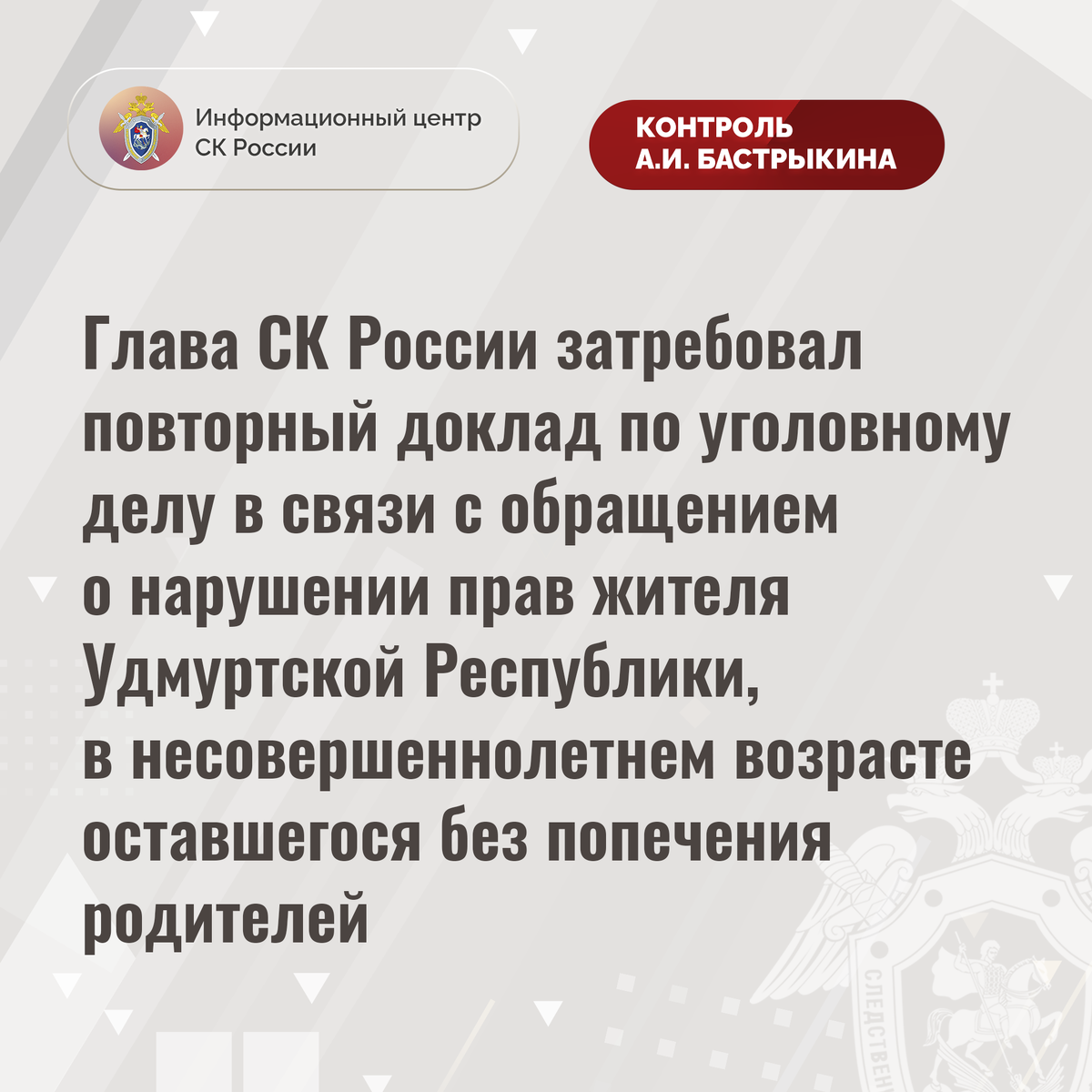 Глава СК России затребовал повторный доклад по уголовному делу в связи с обращением о нарушении прав жителя Удмуртской Республики, в несовершеннолетнем возрасте оставшегося без попечения родителей В адрес Председателя СК России А.И. Бастрыкина через его приёмную в социальной сети «ВКонтакте» поступило обращение в интересах жителя города Ижевска, в несовершеннолетнем возрасте оставшегося без попечения родителей, по вопросу длительного непредоставления ему положенного по закону жилья. Сотрудниками компетентных органов не принято своевременных мер к постановке его на учет лиц, подлежащих обеспечению жилыми помещениями. При этом мужчина неоднократно самостоятельно обращался с заявлением о включении в специализированную очередь, однако получал отказы. Из-за отсутствия постоянного места жительства он лишен возможности официального трудоустройства. В СУ СК России по Удмуртской Республике расследуется уголовное дело, по которому ранее А.И. Бастрыкин поручал представить доклад. Председатель Сл