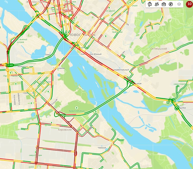 Новосибирск замер в десятибалльных пробках. Дороги завалены снегом, проехать невозможно (зелёненьким только четвёртый мост, ведущий из пробки в пробку, который был завален снегом ещё до снегопадов).