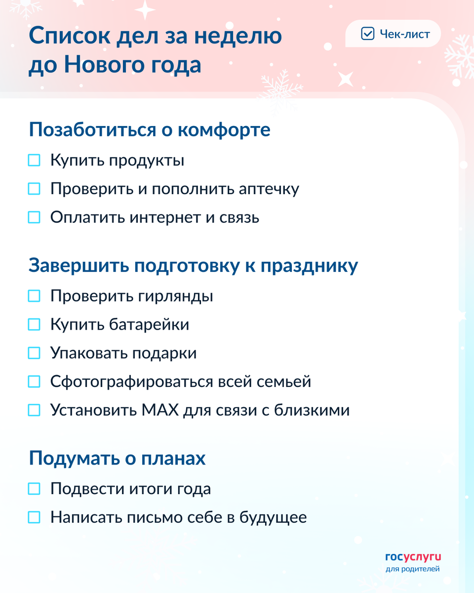 Чтобы в последние дни года спокойно фотографироваться у елки, готовить праздничные блюда и принимать поздравления от близких, готовьтесь к празднику постепенно и не откладывайте рутинные дела. В карточке — только самые важные задачи, которые могут застать врасплох в последний день года. Уделите им время сейчас, чтобы не беспокоиться 31 декабря. Чек-листы для подготовки к Новому году: