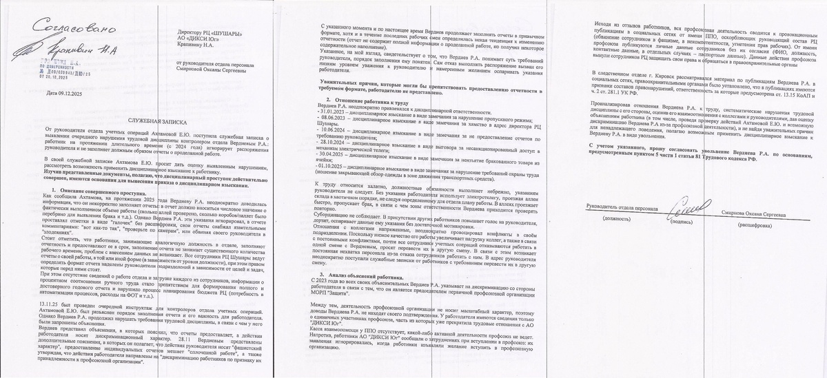 И снова мы вынуждены писать о преследовании руководством «Дикси» Рауфа Вердиева, лидера первички профсоюза "Защита рабочих" АО "ДИКСИ Юг" (входит в Союз Профсоюзов России). В настоящее время руководство «Дикси» подало руководство профсоюза «обращение о мотивированном мнении» о будущем увольнении Вердиева. Причём, так торопились, что вопреки требованиям закона подали заявление не в первичку, а сразу в головную организацию профсоюза. Как такая ситуация возникла? Всё очень просто. Когда у тебя на объекте постоянно переработки, нарушения техники безопасности, производственные травмы, это вызывает создания профсоюза. А когда профсоюз начинает консультации, помогает работникам оформлять юридически правильные заявления, освещает происходящее в СМИ и интернете, это уже совсем раздражает. В итоге происходит своеобразная карусель. На Рауфа Вердиева рисуют нарушения, увольняют, он восстанавливается через суд. На него рисуют нарушения снова. В настоящее время идёт стадия сбора «документов» для оче
