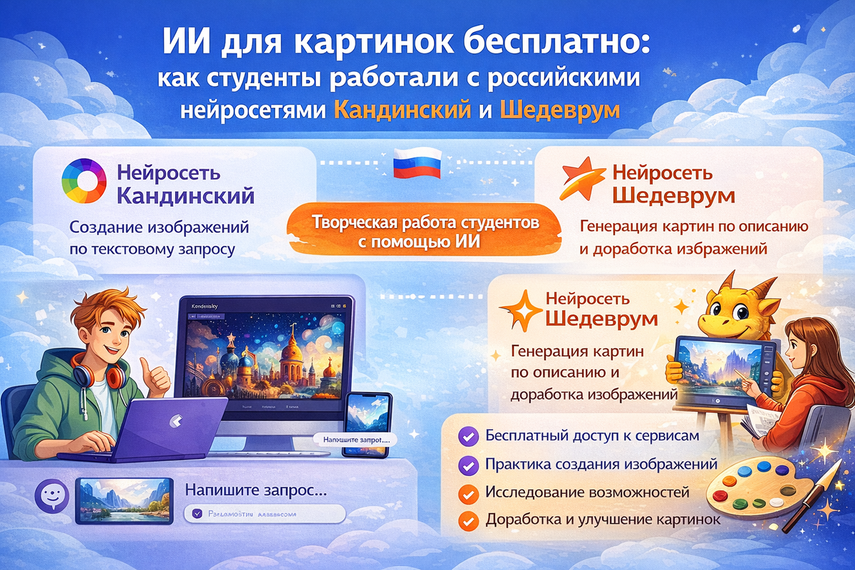 Из 620 студентов минимум девять документировали работу с российскими нейросетями и Telegram-ботами для визуала. Нейросеть Кандинский полностью бесплатна, понимает русский язык и работает без ограничений на количество генераций. Она закрывала статику — обложки, графику, иллюстрации. Шедеврум генерирует изображения в разрешении 1024×1024 пикселя и создаёт короткие видео длиной 4 секунды