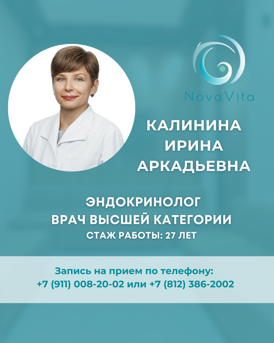 Калинина Ирина Аркадьевна — врач-эндокринолог высшей квалификационной категории. 👩⚕️Член Российской ассоциации эндокринологов. Стаж работы — 27 лет Ирина Аркадьевна (https://novavita.ru/specialist/kalinina-irina-arkadevna/) — специалист с многолетним клиническим опытом и глубокой экспертизой в диагностике и лечении эндокринных заболеваний у взрослых и беременных пациентов. 🩺 С какими вопросами можно обратиться: • Диагностика и лечение нарушений углеводного обмена: предиабет, сахарный диабет всех типов • Подбор современной терапии с достижением целевых показателей • Заболевания щитовидной и паращитовидных желез, включая послеоперационные состояния • Заболевания гипофиза (гиперпролактинемия, аденомы, несахарный диабет) • Патология надпочечников и половых желез • Диагностика и лечение остеопороза • Коррекция избыточного веса и лечение ожирения • Подготовка и сопровождение пациентов до и после бариатрических операций • Выявление и коррекция андрогенного дефицита у мужчин • Ведение пацие