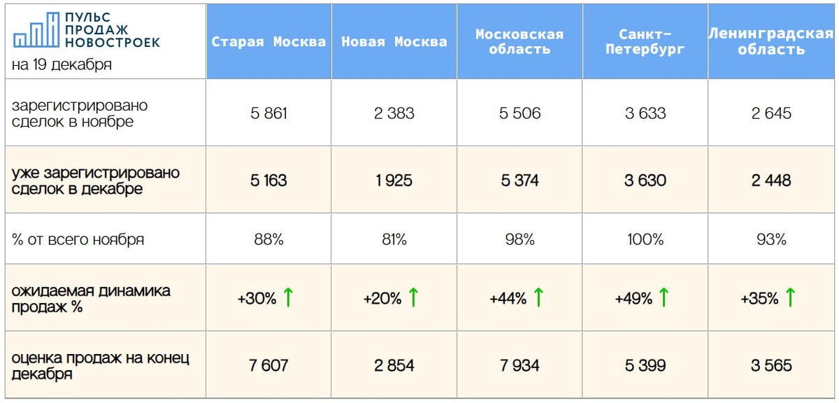 Декабрь традиционно это месяц роста продаж новостроек, и в 2025 году он не станет исключением. Ожидаем рост. 📈 Данные в таблице. Кратко: 🔼 Старая Москва: уже прошло регистрацию порядка 5 163 сделок, прогноз +30% (7 607 ДДУ за декабрь) 🔼 Новая Москва: 1925 сделок, прогноз +20% 🔼 Московская область: 5374 сделки, прогноз +44% 🔼 Санкт-Петербург: 3630 сделок, прогноз +49% 🔼 Ленинградская область: 2448 сделок, прогноз +35% 🔥 @pulsprodaj