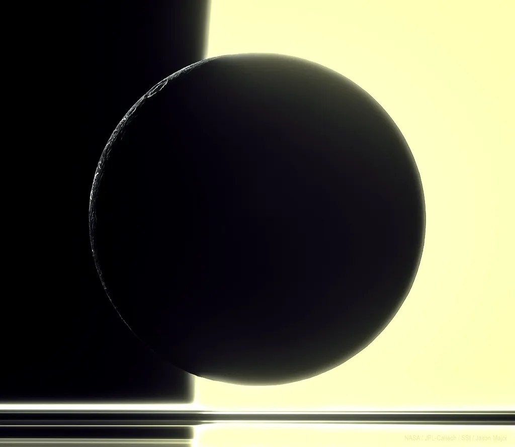 Это силуэт Дионы шириной 1122 км на фоне Сатурна — снимок, сделанный аппаратом «Кассини» 15 лет назад, 20 декабря 2010 года